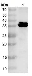 Western blot analysis was performed using anti-EV71 VP1/Capsid protein VP1 polyclonal antibody at 1ug/mL on recombinant EV71 VP1/Capsid protein VP1 (Catalog No.:TD-VK633012).,Western blot analysis was performed using anti-EV71-VP1 polyclonal antibody at 1ug/mL on various samples.Lane 1:recombinant EV71 VP1/Capsid protein VP1 (Catalog No:TD-VK633012)