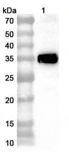 Western blot analysis was performed using anti-3C-PDCOV polyclonal antibody at 1ug/mL on various samples.Lane 1:recombinant PDCoV Nsp5/Mpro/3CL (Catalog No:TD-VK537012)