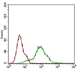 Flow cytometric analysis of Hela cells using CD68 mouse mAb (green) and negative control (red).