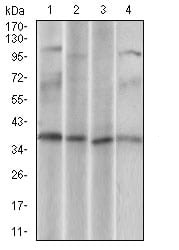 Western blot analysis using CD68 mouse mAb against U937 (1), Hela (2), HepG2 (3), Jurkat (4) cell lysate.