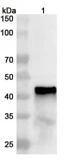 Western blot analysis was performed using anti-Influenza A virus (H7N9) NA/Neuraminidase polyclonal antibody at 1ug/mL on recombinant Influenza A virus (H7N9) NA/Neuraminidase (Catalog No.:TD-VK496012).,Western blot analysis was performed using anti-NA-H7N9 polyclonal antibody at 1ug/mL on various samples.Lane 1:recombinant Influenza A virus (H7N9) NA/Neuraminidase (Catalog No:TD-VK496012)