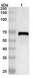 Western blot analysis was performed using anti-JEV NS1/Non-structural protein 1 polyclonal antibody at 1ug/mL on recombinant JEV NS1/Non-structural protein 1 (Catalog No.:TD-VK489012).,Western blot analysis was performed using anti-JEV-NS1 polyclonal antibody at 1ug/mL on various samples.Lane 1:recombinant JEV NS1/Non-structural protein 1 (Catalog No:TD-VK489012)