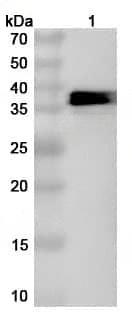Western blot analysis was performed using anti-E1B polyclonal antibody at 1ug/mL on various samples.Lane 1:recombinant HAdV-5 E1B-55K/E1B-495R (Catalog No:TD-VK466022)