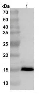 Western blot analysis was performed using anti-2-EP153R polyclonal antibody at 1ug/mL on various samples.Lane 1:recombinant ASFV EP153R (Catalog No:TD-VK462012)