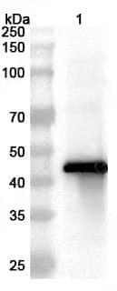 Western blot analysis was performed using anti-FeCoV-N polyclonal antibody at 1ug/mL on various samples.Lane 1:recombinant FCoV NP/Nucleoprotein (Catalog No:TD-VK405012)