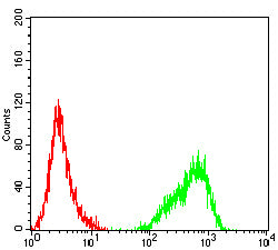 Flow cytometric analysis of Jurkat cells using CD62E mouse mAb (green) and negative control (red). |