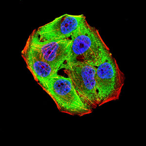 Immunofluorescence analysis of Hela cells using CD62E mouse mAb (green). Blue: DRAQ5 fluorescent DNA dye. Red: Actin filaments have been labeled with Alexa Fluor- 555 phalloidin. Secondary antibody from Fisher (Cat#: 35503) |