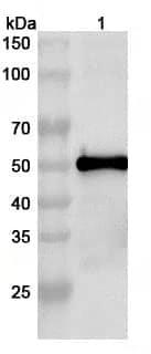 Western blot analysis was performed using anti- polyclonal antibody at 1ug/mL on various samples.Lane 1:recombinant CHPV G/Glycoprotein (Catalog No:TD-VK396012)