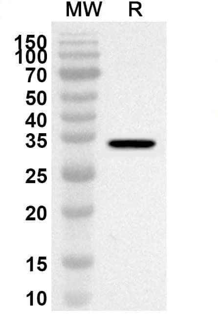 Western blot analysis was performed using anti-Mouse CSF1/M-CSF polyclonal antibody at 1ug/mL on recombinant Mouse CSF1/M-CSF (Catalog No.:TD-MY515012).