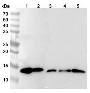 Western blot analysis was performed using anti-LGALS1 polyclonal antibody at 1µg/ml on various samples.Lane 1:NIH3T3 cell lysateLane 2:PC-12 cell lysateLane 3:HepG2 cell lysateLane 4:LO2 cell lysateLane 5:Hela cell lysate