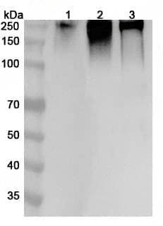 Western blot analysis was performed using anti-PTPRC polyclonal antibody at 1ug/mL on various samples.Lane 1:RAW264.7 cell lysateLane 2:Mouse spleen lysateLane 3:Mouse thymus lysate