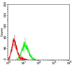 Flow cytometric analysis of HL-60 cells using CD49C mouse mAb (green) and negative control (red). |