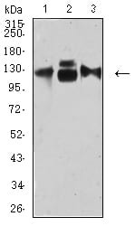 Western blot analysis using CD49C mouse mAb against HepG2 (1), HUVEC (2), and HUVE-12 (3) cell lysate. |