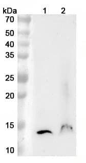 Western blot analysis was performed using anti-TFF2 polyclonal antibody at 1ug/mL on various samples.Lane 1:Mouse stomach lysateLane 2:Mouse pancreas lysate