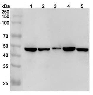 Western blot analysis was performed using anti-IL1RL1 polyclonal antibody at 1µg/ml on various samples.Lane 1:Hela cell lysateLane 2:SGC-7901 cell lysateLane 3:HUVEC cell lysateLane 4:HepG2 cell lysateLane 5:Mouse brain lysate