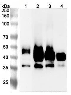 Western blot analysis was performed using anti-BSG polyclonal antibody at 1ug/mL on various samples.Lane 1:U87 cell lysateLane 2:Mouse spleen lysateLane 3:Mouse heart lysateLane 4:Mouse liver lysate