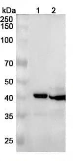 Western blot analysis was performed using anti-CTSK polyclonal antibody at 1ug/mL on various samples.Lane 1:Mouse skeletal muscle lysateLane 2:Rat skeletal muscle lysate