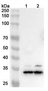 Western blot analysis was performed using anti-CD79B polyclonal antibody at CD79B on various samples.Lane 1:Daudi cell lysateLane 2:HL-60 cell lysate