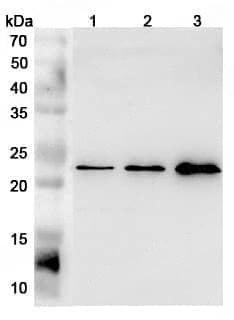 Western blot analysis was performed using anti-FGF21 polyclonal antibody at 1μg/ml on various samples.Lane 1:HepG2 cell lysateLane 2:Raji cell lysateLane 3:293T cell lysate