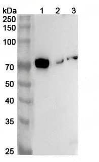 Western blot analysis was performed using anti-DLL4 polyclonal antibody at 1ug/mL on various samples.Lane 1:Rat lung lysateLane 2:Rat kidney lysateLane 3:Rat pancears lysate