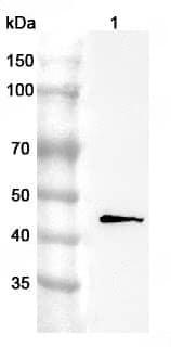 Western blot analysis was performed using anti-GDF7 polyclonal antibody at 1ug/mL on various samples.Lane 1:HT-29 cell lysate