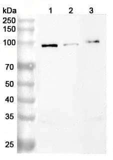 Western blot analysis was performed using anti-ACE2 polyclonal antibody at 1ug/mL on various samples.Lane 1:Mouse testis lysateLane 2:Mouse lung lysateLane 3:Rat testis lysate