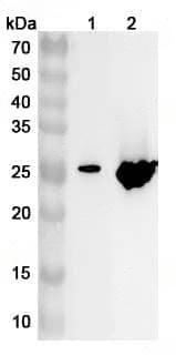Western blot analysis was performed using anti-GSTA3 polyclonal antibody at GSTA3 on various samples.Lane 1:Rat testis lysateLane 2:Mouse liver lysate
