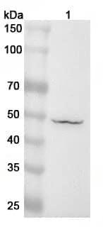 Western blot analysis was performed using anti-PLA1A polyclonal antibody at 1ug/mL on various samples.Lane 1:Hela cell lysate