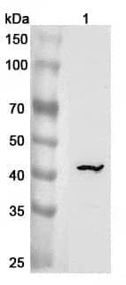 Western blot analysis was performed using anti-ST6GALNAC2 polyclonal antibody at 1ug/mL on various samples.Lane 1:Mouse liver lysate