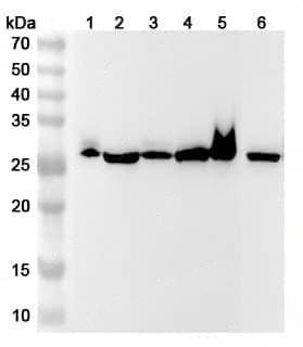 Western blot analysis was performed using anti-CA1 polyclonal antibody at CA1 on various samples.Lane 1:Mouse spleen lysateLane 2:Rat spleen lysateLane 3:Mouse lung lysateLane 4:Rat lung lysateLane 5:Mouse colon lysateLane 6:Rat brain lysate