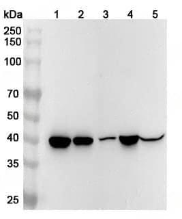 Western blot analysis was performed using anti-ADA polyclonal antibody at ADA on various samples.Lane 1:Jurkat cell lysateLane 2:MOLT-4 cell lysateLane 3:Mouse thymus lysateLane 4:Mouse stomach lysateLane 5:Rat spleen lysate