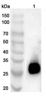 Western blot analysis was performed using anti-CRISP2 polyclonal antibody at 1ug/mL on various samples.Lane 1:Rat testis lysate