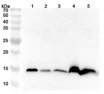 Western blot analysis was performed using anti-FABP4 polyclonal antibody at 1ug/mL on various samples.Lane 1:Mouse thymus lysateLane 2:Mouse heart lysateLane 3:Mouse skeletal muscle lysateLane 4:Rat thymus lysateLane 5:Rat heart lysate