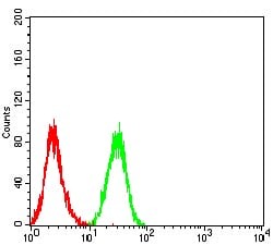 Flow cytometric analysis of HL-60 cells using CD11a mouse mAb (green) and negative control (red). |