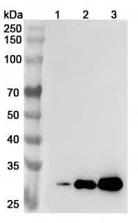 Western blot analysis was performed using anti-C1RA polyclonal antibody at 1ug/mL on various samples.Lane 1:Mouse liver lysateLane 2:Mouse lung lysateLane 3:Mouse kidney lysate