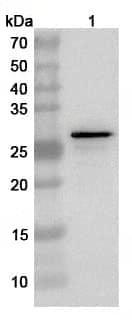 Western blot analysis was performed using anti-p30 polyclonal antibody at 1ug/mL on various samples.Lane 1:recombinant Mycoplasma pneumoniae P30 adhesin (Catalog No:TD-JN837012)