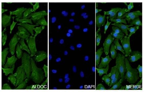 Hela cells were fixed with 4% paraformaldehyde for 20 minutes, followed by blocking with 5% goat serum for 1 hour. The cells were then incubated with a primary antibody targeting ALDOC (TD-HY519014) at a concentration of 24 ug/ml overnight at 4°C. Afterward, the cells were incubated with a secondary antibody, Goat Anti-Rabbit IgG (Alexa Fluor-488) for 50 minutes at room temperature. The localization of ALDOC was visualized (shown in green), and nuclear DNA was stained with DAPI (shown in blue). | Western blot analysis was performed using anti-ALDOC polyclonal antibody at 1μg/ml on various samples.Lane 1:MCF7 cell lysateLane 2:LO2 cell lysateLane 3:k562 cell lysateLane 4:Jurkat cell lysateLane 5:Mouse brain lysateLane 6:Mouse kidney lysateLane 7:Mouse muscle lysateLane 8:Mouse heart lysate