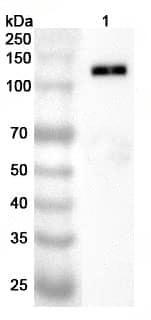 Western blot analysis was performed using anti-GP1BA polyclonal antibody at 1ug/mL on various samples.Lane 1:K562 cell lysate