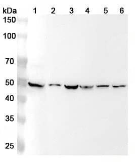 Western blot analysis was performed using anti-HAPLN1 polyclonal antibody at 1ug/mL on various samples.Lane 1:HepG2 cell lysateLane 2:Caco2 cell lysateLane 3:HUVEC cell lysateLane 4:SW480 cell lysateLane 5:U2OS cell lysate