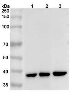 Western blot analysis was performed using anti-GNAO1 polyclonal antibody at 1μg/ml on various samples.Lane 1:Mouse cerebellum lysateLane 2:Rat brain lysateLane 3:Rat cerebellum lysate