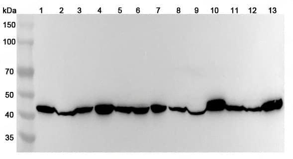 Western blot analysis was performed using anti-PGK2 polyclonal antibody at 1μg/ml on various samples.Lane 1:U87 cell lysateLane 2:Jurkat cell lysateLane 3:Hela cell lysateLane 4:HepG2 cell lysateLane 5:A549 cell lysateLane 6:Raji cell lysateLane 7:Molt-4 cell lysateLane 8:Mouse brain lysateLane 9:Mouse heart lysateLane 10:Mouse testis lysateLane11:Rat brain lysateLane12:Rat heart lysateLane13:Rat testis lysate