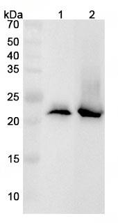 Western blot analysis was performed using anti-TNNI2 polyclonal antibody at 1ug/mL on recombinant TNNI2 (Catalog No.:TD-HW532012).,Western blot analysis was performed using anti-TNNI2 polyclonal antibody at 1ug/mL on various samples.Lane 1:C2C12 cell lysateLane 2:Mouse skeletal muscle lysate