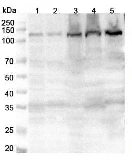 Western blot analysis was performed using anti-DAAM1 polyclonal antibody at 1μg/ml on various samples.Lane 1:Hela cell lysateLane 2:HepG2 cell lysateLane 3:Jurkat cell lysateLane 4:Mouse liver lysateLane 5:Mouse brain lysateLane 6:Mouse heart lysate