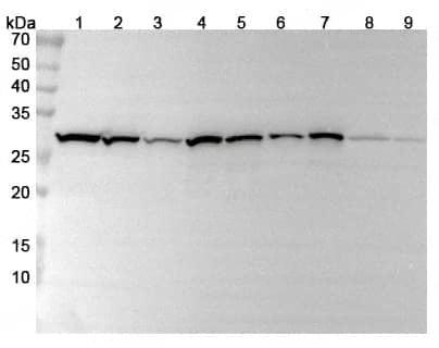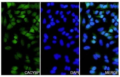 Hela cells were fixed with 4% paraformaldehyde for 20 minutes, followed by blocking with 5% goat serum for 1 hour. The cells were then incubated with a primary antibody targeting CACYBP (TD-HV095014) at a concentration of 14.4 ug/ml overnight at 4°C. Afterward, the cells were incubated with a secondary antibody, Goat Anti-Rabbit IgG (Alexa Fluor-488) for 50 minutes at room temperature. The localization of CACYBP was visualized (shown in green), and nuclear DNA was stained with DAPI (shown in blue). | Western blot analysis was performed using anti-CACVBP polyclonal antibody at 1μg/ml on various samples.Lane 1:K562 cell lysateLane 2:HCT116 cell lysateLane 3:MCF7 cell lysateLane 4:293T cell lysateLane 5:HepG2 cell lysateLane 6:HL60 cell lysateLane 7:Jurkat cell lysateLane 8:Rat brain lysateLane 9:Rat liver lysate