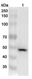 Western blot analysis was performed using anti-KRT36 polyclonal antibody at KRT36 on various samples.Lane 1:Mouse skin lysate