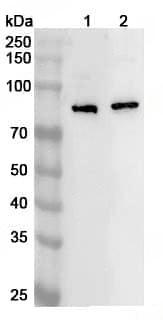 Western blot analysis was performed using anti-ECD polyclonal antibody at ECD on various samples.Lane 1:Mouse brain lysateLane 2:Rat brain lysate