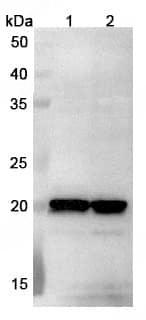Hela cells were fixed with 4% paraformaldehyde for 20 minutes, followed by blocking with 5% goat serum for 1 hour. The cells were then incubated with a primary antibody targeting NME6 (TD-HF556014) at a concentration of 26.6 ug/ml overnight at 4°C. Afterward, the cells were incubated with a secondary antibody, Goat Anti-Rabbit IgG (Alexa Fluor-488) for 50 minutes at room temperature. The localization of NME6 was visualized (shown in green), and nuclear DNA was stained with DAPI (shown in blue). | Western blot analysis was performed using anti-NME6 polyclonal antibody at 1μg/ml on various samples.Lane 1:Lncap cell lysateLane 2:U20S cell lysate
