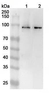 Western blot analysis was performed using anti-LARS2 polyclonal antibody at 1ug/mL on various samples.Lane 1:HepG2 cell lysateLane 2:Hela cell lysate
