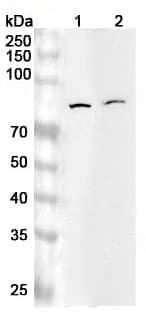 Western blot analysis was performed using anti-MOGS polyclonal antibody at 1ug/mL on various samples.Lane 1:Mouse brain lysateLane 2:Rat brain lysate