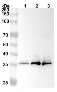 Western blot analysis was performed using anti-STX4 polyclonal antibody at 1ug/mL on various samples.Lane 1:Hela cell lysateLane 2:HL-60 cell lysateLane 3:K562 cell lysate